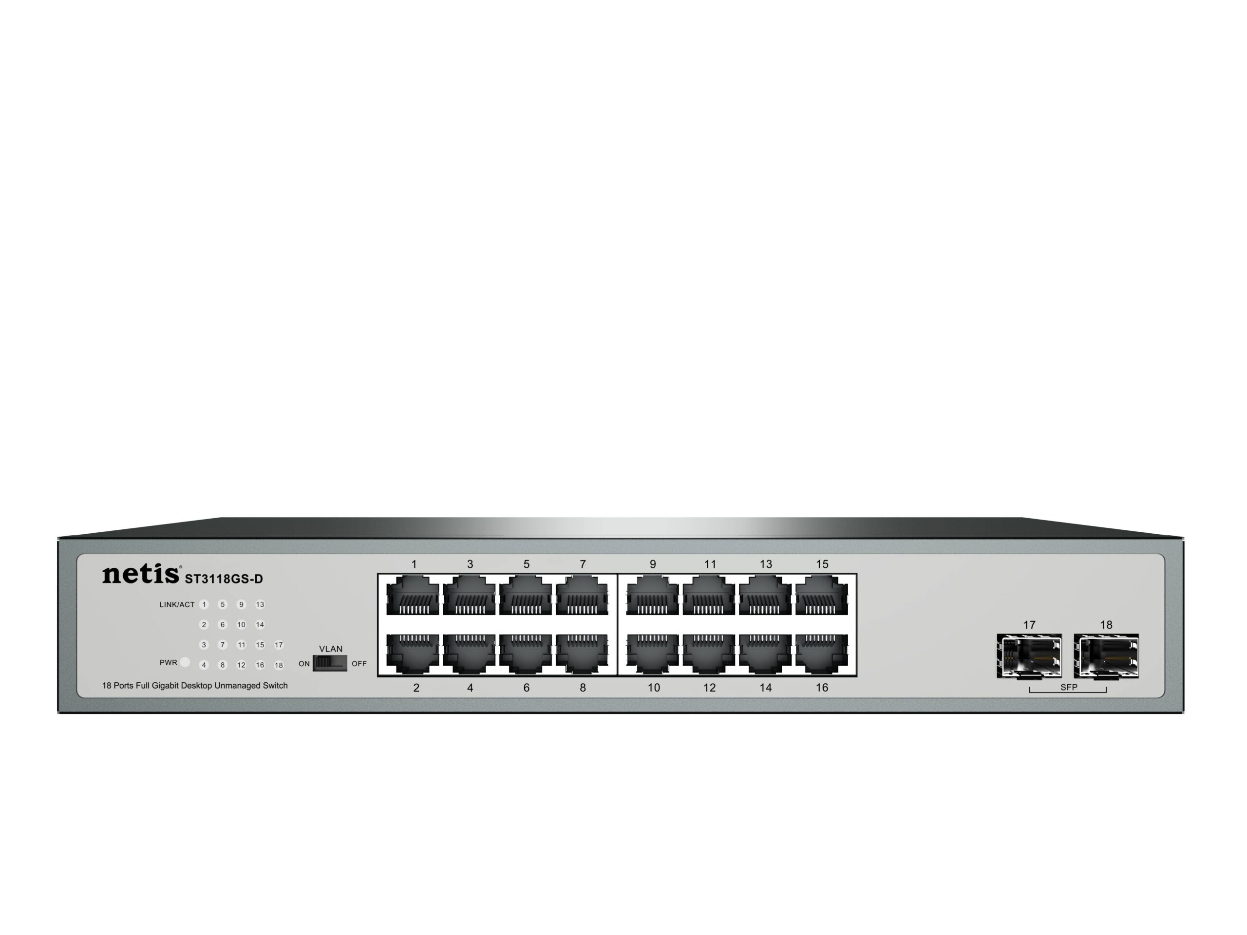 Switch NETIS modelo ST3118GS-D, 16 Puertos y 2 Puertos SFP Gigabit, montable en rack, No administrable